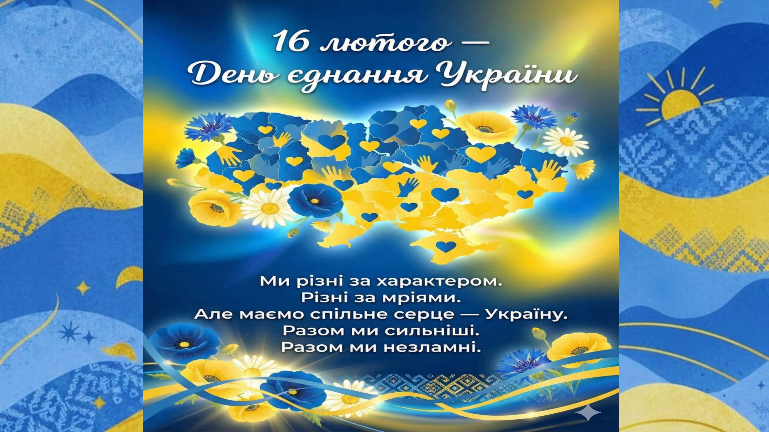 День єднання – це про синє небо й жовте поле в наших серцях, незламність, віру в майбутнє, взаємопідтримку та любов до Батьківщини. Сьогодні, як ніколи, важливо пам’ятати: наша сила – в єдності, а перемога приходить до тих, хто разом прагне миру, добра та справедливості.